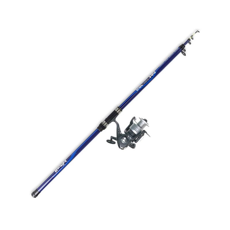 Canna da pesca telescopica a 5 anelli in fibra di vetro, ideale per la pesca in surfcasting. Punta fluorescente all'estremità della canna per visualizzare le abboccate di giorno come di notte. Mulinello ambidestro