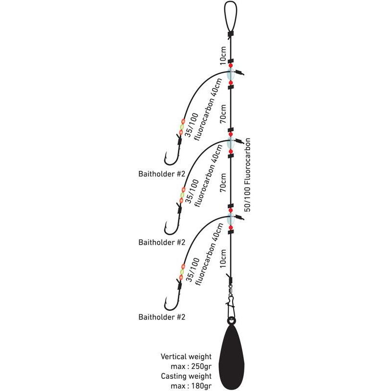 Montaggio realizzato in fluorocarbonio con 3 bracciolini contenenti ami Baitholder di misura n°2. Montaggi stoccati su rulli in schiuma rossa, confezionati in confezioni da 2