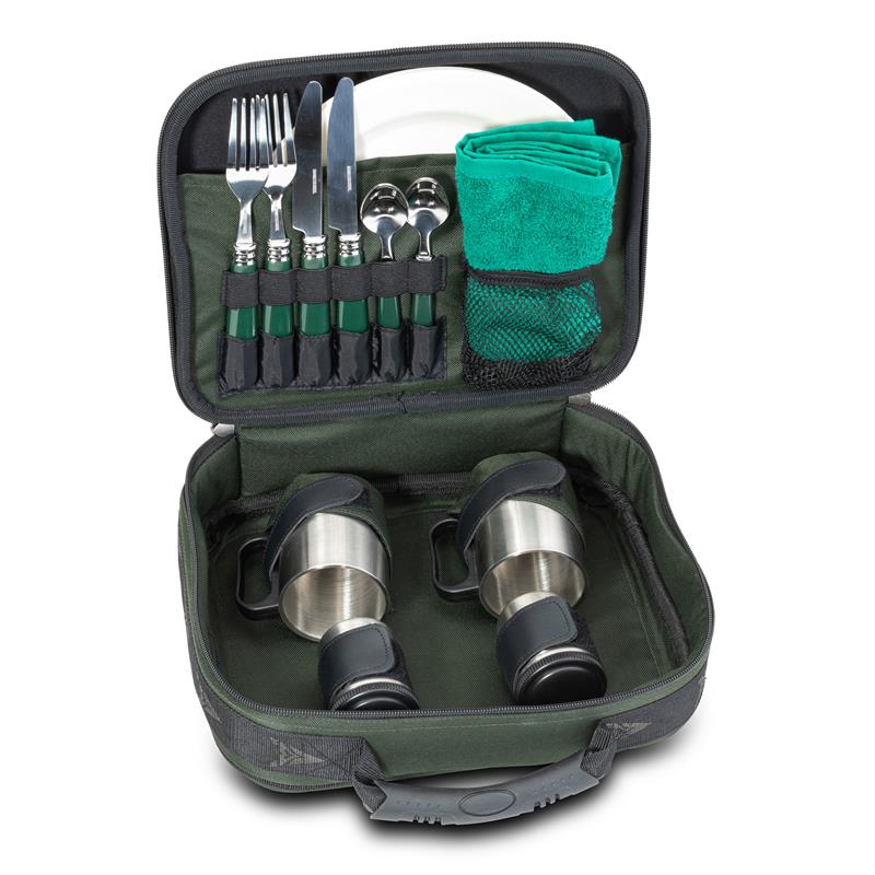 Contenuto : • 2 x piatti • 2 x coltello, forchetta e cucchiaino da caffè 2 x bicchieri da caffè in acciaio inossidabile • 2 x recipienti per il latte e lo zucchero • 1 x tovagliolo • Materiale : nylon 600D • Dimensioni : 33 x 27 x 12 cm