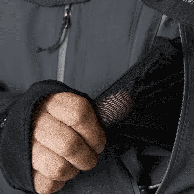 tasche e funzionalità : • tasche pettorali con cerniera ykk® aquaguard®. all'interno troverete un supporto in hypalon per fissare i vostri utensili preferiti grazie ai nostri magneti e/o al nostro sistema di fissaggio. adattamento delle aspettative: impermeabile se la cerniera è ben chiusa e non è immersa. nonostante il loro design impermeabile, raccomandiamo di non considerare queste tasche come contenitori stagni. la fodera delle tasche è parzialmente impermeabile, il che significa che non colerà. prevedete della condensa. proteggete ulteriormente il vostro telefono e i dispositivi elettronici. • la tasca sinistra è dotata di una tasca in rete estensibile integrata. • tasca napoleon interna con cerniera ykk®. • tasca interna in rete elastica. ideale per riporre una scatola da pesca o accessori aggiuntivi. • anello a D. • attacco in hypalon per il fissaggio di accessori all'esterno della giacca. • il cappuccio è facilmente staccabile dal colletto e regolabile in circonferenza, visibilità e profondità. è dotato di una visiera parasole e si ripone facilmente. • chiusura delle maniche in hypalon con velcro® originale. • il mezzoguanto in lycra può essere utilizzato in tre modi diversi: 1: come mezzoguanto. 2: come scalda-polso. 3: completamente riposto. • ampia tasca posteriore. abbottonabile nel tessuto esterno, offre un design più pulito quando non viene utilizzata. • gomito rinforzato e articolato.