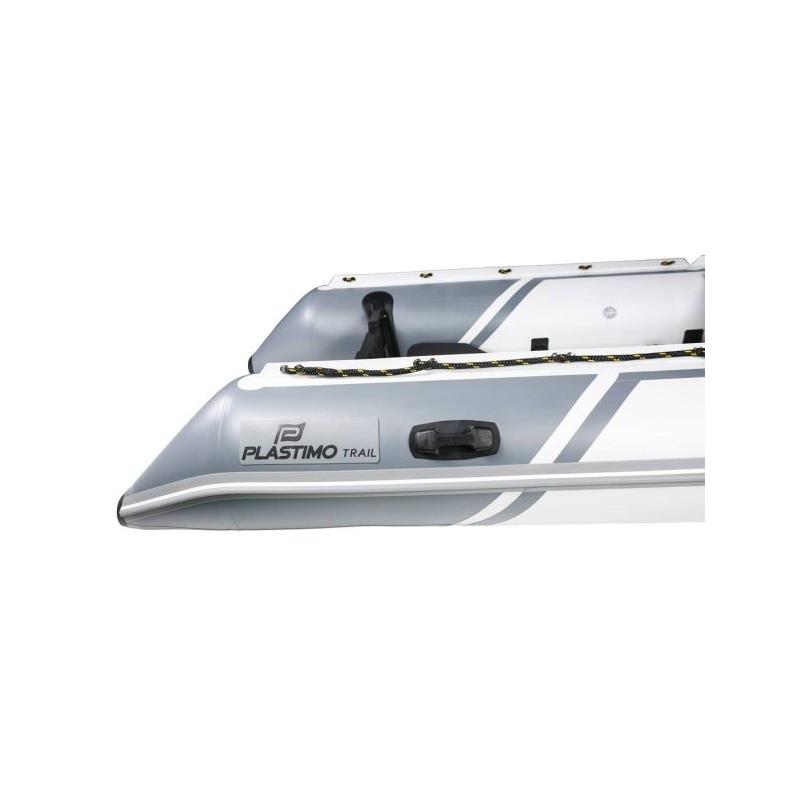 • Design innovativo e coni posteriori rinforzati. • Armonia di grigio chiaro e grigio ardesia. • Impugnatura nera con rete gialla in polipropilene Ø 10 mm per una buona presa. • Porta pagaie sul fondo del gommone. • Cinghia per fissaggio tanica. • Costruzione in PVC 1100 Decitex per una migliore resistenza all'abrasione.