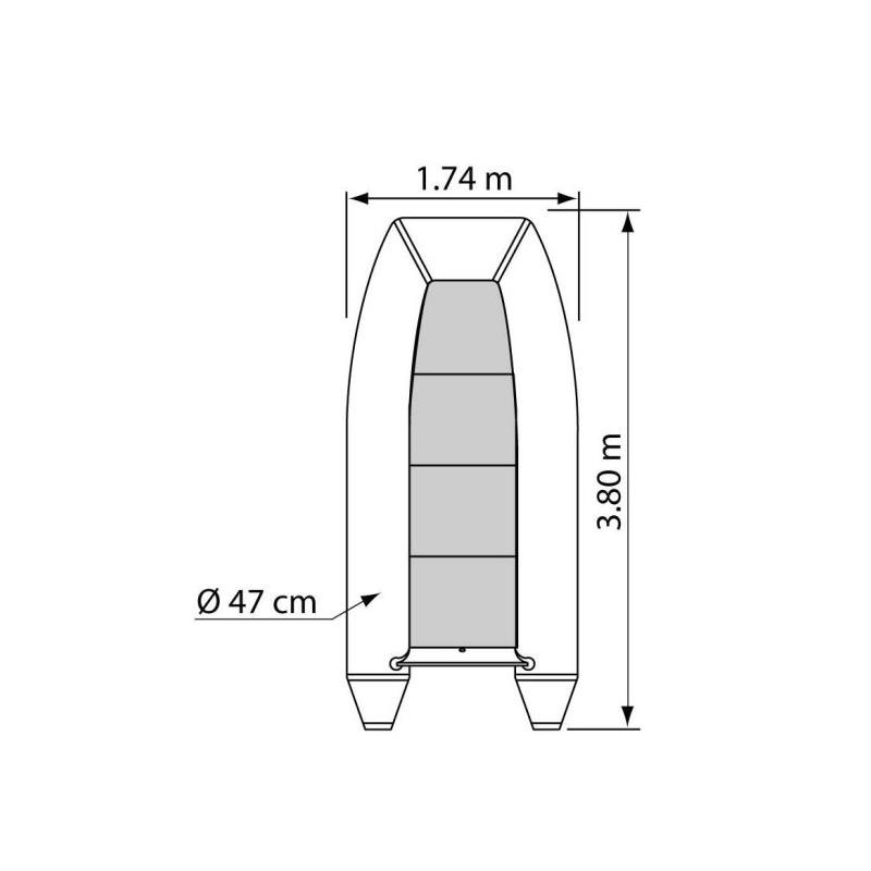 • dimensioni: 380 x 174 x 83 cm • colore: grigio • diametro dei tubolari: 47 cm • materiale: PVC • modello: p380ha • numero di persone: 6.5 / 850kg • peso: 68.8 kg • potenza motore massima: 18,4 kW (25 CV) • tipo di pavimento: pieno, alluminio • dimensioni da ripiegata: 125 x 58 x 35 cm • carico massimo: 850 kg