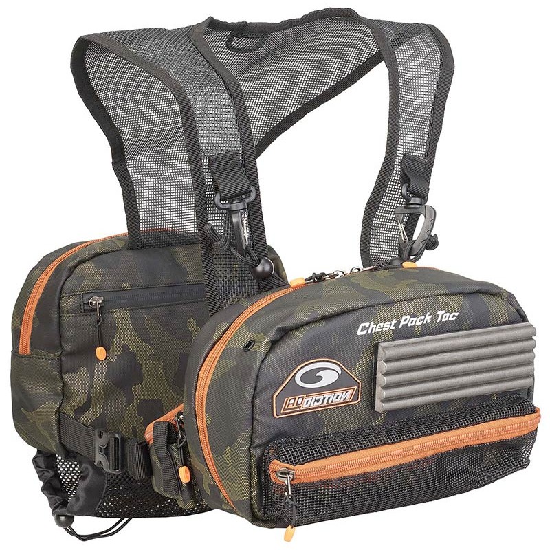 • chestpack (borsello frontale) speciale pesca alla toc • mini moschettoni per agganciare le chiavi nelle tasche laterali • fibbie rapide con cordino per il trasporto di bobine • parte anteriore per lo stoccaggio e il riordino degli accessori che funge anche da piano di montaggio, tasca per bobine con uscita frontale, separatori rimovibili, schiuma di stoccaggio per ninfe/mosche/ami, compartimento anteriore arieggiato che permette di vedere il contenuto e di lasciarlo asciugare se necessario • mini tasca frontale in rete gommata • piastra magnetica e in schiuma rimovibili per lo stoccaggio temporaneo di mosche e ninfe artificiali • parte posteriore per lo stoccaggio di un indumento impermeabile o di accessori di soccorso e rete porta bottiglia. cinghia centrale regolabile con 2 fibbie rapide, girovita max ~1m50. tessuto effetto mimetico.