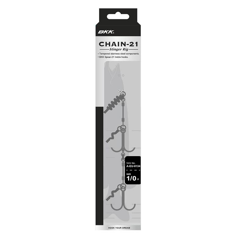 Il BKK Chain-21 è un montaggio stinger appositamente progettato per la pesca del luccio con grandi esche morbide. Le sue girelle allungate distribuiscono le forze di torsione e offrono una grande libertà di movimento, riducendo così il rischio di slamata. Una vite frontale e dei ganci a forma di Z fissano saldamente il montaggio all'esca, garantendo una presentazione regolare lancio dopo lancio.
