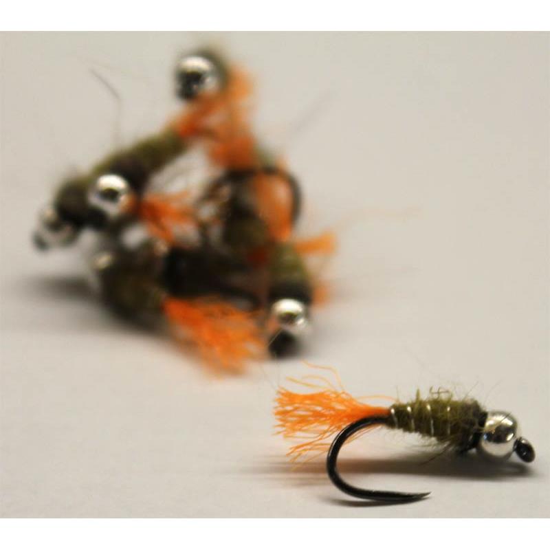 • Corpo : corpo in dubbing oliva cerchiato con filo di rame argentato.