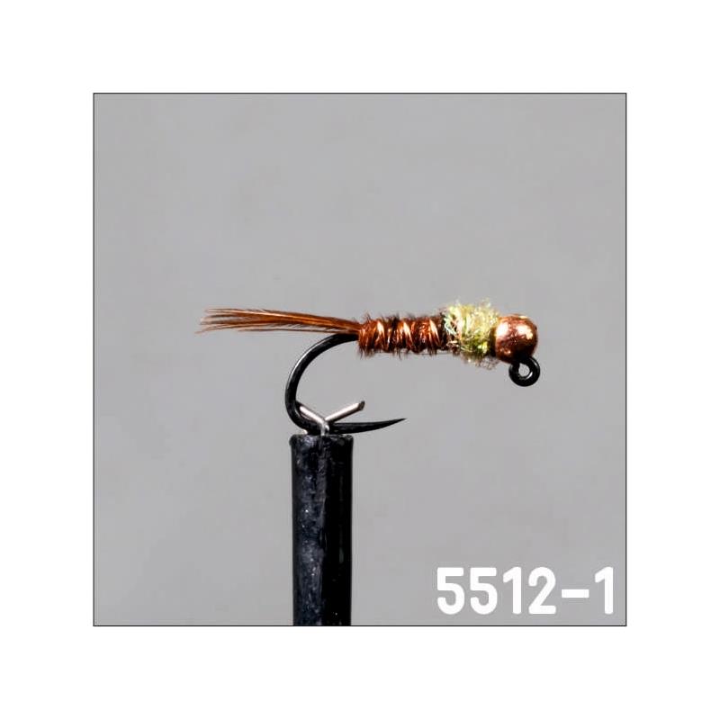 5512-1 : ninfa dritta di misura media e classificata come ninfa imitativa. modello ispirato alla celebre « pheasant tail ». montaggio jig con corpo in fagiano. perlina e cerclaggio in rame per mantenere un aspetto neutro. aggiunta di un torace in fibre sintetiche colore oliva per assicurare lievi riflessi e mettere in evidenza l’imitazione. ninfa d’insieme che propone un aspetto naturale.