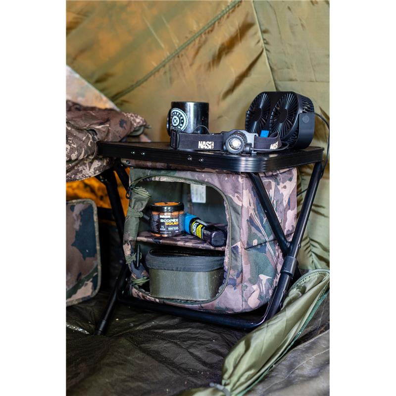 • montaggio e smontaggio ultra rapidi • costruzione in nylon 600d robusto • i ripiani rivestiti 600d integrali restano in posizione una volta piegati • accesso con zip su 3 lati ai ripiani interni con attacchi elastici a sgancio • piano del tavolo rimovibile • vani previsti per la borsa da trasporto in nylon • piedi regolabili con bloccaggio a rotazione • finiture camouflage nash