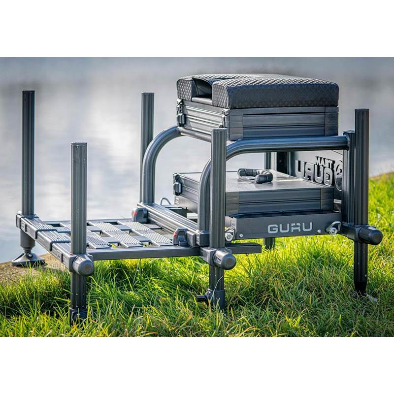 che cosa ha in più rispetto alla prima versione ? • entrambe le stazioni sono dotate di una verniciatura migliorata per minimizzare lo scolorimento (verniciatura protetta contro i raggi uv). • la nuova piastra posteriore è dotata di un nuovo design con l'iscrizione "knowledge is power" (la conoscenza è potere). • il piano è dotato di nuovi sistemi magnetici che vi permettono di riporlo e di staccare facilmente la valigetta sotto il cestello-sedile. • seduta "dream" di alta qualità e impermeabile. • i lati portano il marchio guru e sono abbinati alle fasce in alluminio. • fornita con tracolla di trasporto imbottita, una protezione per sedile, una cassetta rimovibile e uno scomparto con plioirs per lenze. • compatibile con le cassette rive • diametro dei piedi : 36mm d36 • poggiapiedi hsp scorrevole • uno scomparto sotto la seduta con cassetto laterale di 30mm di altezza.