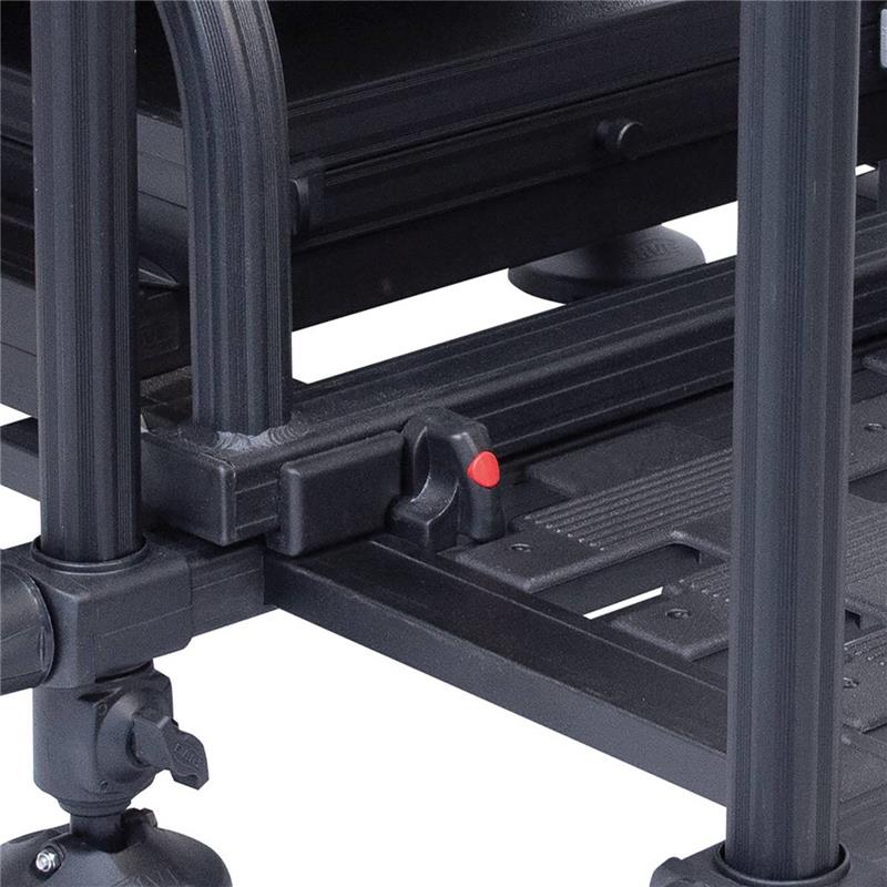 Caratteristiche : • Telaio interamente in alluminio • Cuscino DREAM tallone fisso • Cassetto lato 30 + Cassettino 30 • Valigetta magnetica (cassettino 30) rimovibile • 4 piedi telescopici 420 / 720 mm • 2 piedi fissi 420 mm • Cassettini, piedi e piattaforma anodizzati neri • Piattaforma HSP con chiusure ¼ di giro per 4 posizioni della piattaforma • Protezione della piattaforma • Tracolla a 4 punti • Carrello Alu 1 Point - L • Supporto per canne in schiuma • Barra poggia-canna a 7 scatti • Kit carrello con ruote antiforatura
