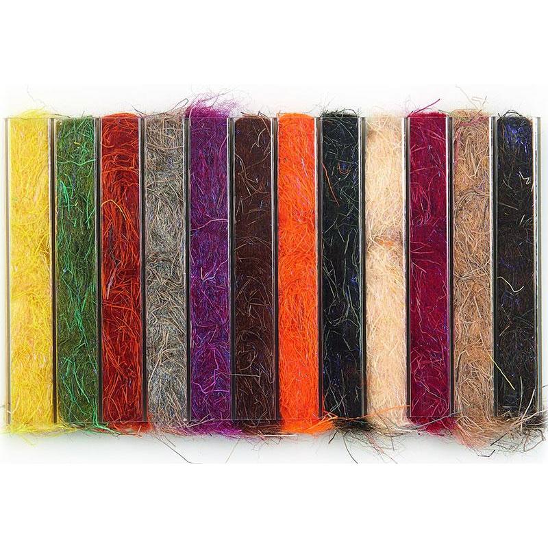 Dubbing sintetico miscelato con pelo di cervo arricchito con fibre brillanti UV. Assortimento di 12 colori di dubbing presentati in distributori extra piatti