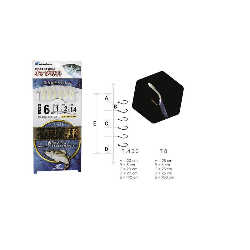 Il Sabiki HS250 HAYABUSA è dotato di 6 ami rif: H.MRS 171. Perfetto per la pesca di piccoli pesci come eperlani, spratti, sardine, severaux, lisette. Il corpo è in pelle arrotolata fosfo e la coda in fibre verdi fosfo con fili di tinsel olografici piatti torsadati. Da utilizzare preferibilmente con scarsa luminosità, in grande profondità o in acque torbide.