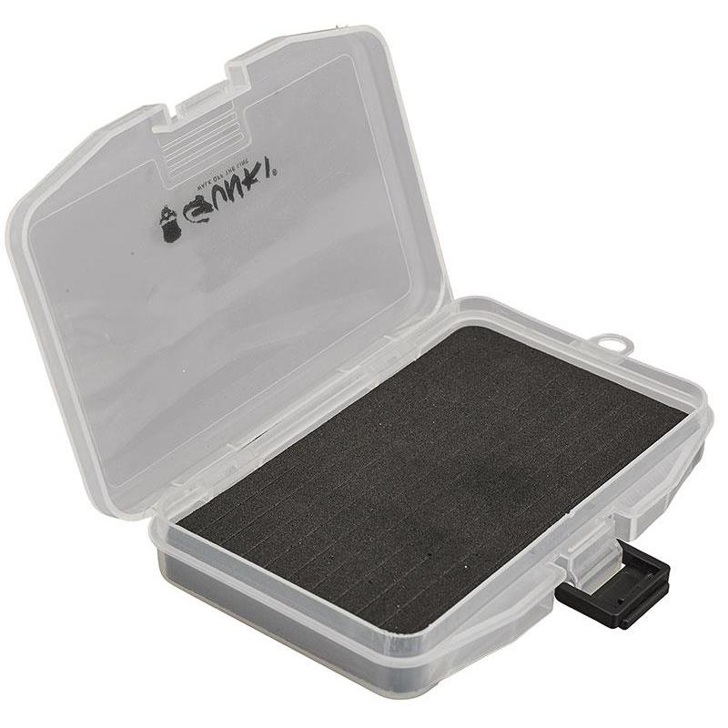 Scatola trasparente, ultra piatta, che si infila facilmente in una tasca! Il suo fondo è rivestito da una piastra in EVA ad alta densità (fessurata da dieci file, distanziate ogni 8mm) per ospitare i vostri cucchiaini e i piccoli artificiali. Molto pratica! Presenza di un occhiello esterno per fissare un cordino di sicurezza.