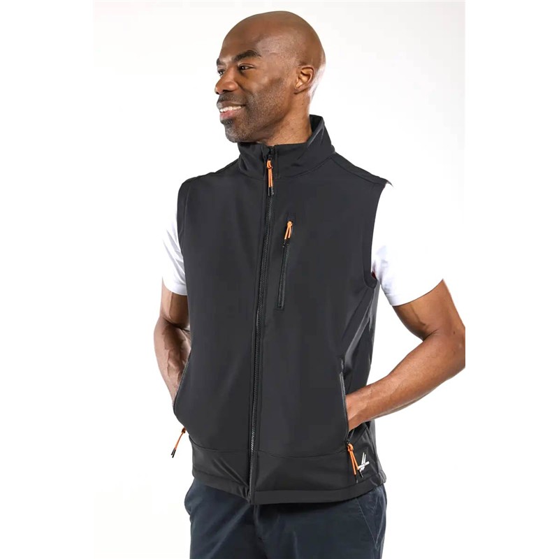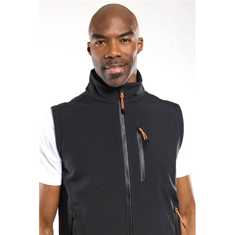 gilet softshell senza maniche, 92% poliestere riciclato 8% elastan con fodera in pile, collo alto, apertura frontale con zip idrorepellente, proteggi mento, due tasche basse con zip, badge bermudes sul fondo della giacca e decorazioni sul retro del colletto e sulla giacca.