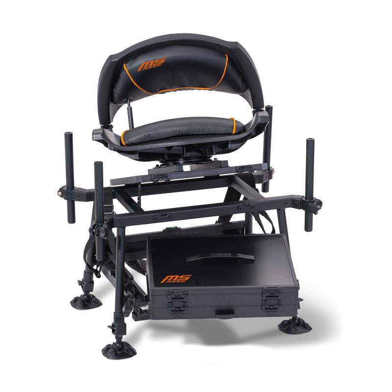 il ms-r seatbox è la migliore base per un soggiorno confortevole durante la pesca al feeder. è dotato di un sedile confortevole in plastica che può essere ruotato e rimosso grazie a cuscinetti a sfera, di un'imbottitura solida sul sedile e sullo schienale, di due cassetti sotto il sedile, di quattro piedi a regolazione rapida e continua con puntali per il terreno, di quattro aste regolabili in altezza (due a destra e due a sinistra) (diametro 25 mm) per ricevere accessori, incluso un filetto sulla parte superiore e una tracolla molto imbottita inclusa nella consegna. sono inoltre previsti binari sulla faccia inferiore per ospitare il poggiapiedi disponibile come optional. una livella a bolla è fissata anche sul retro del cesto-sedia per un allineamento preciso. il tutto è realizzato in alluminio e plastica resistenti alla corrosione.