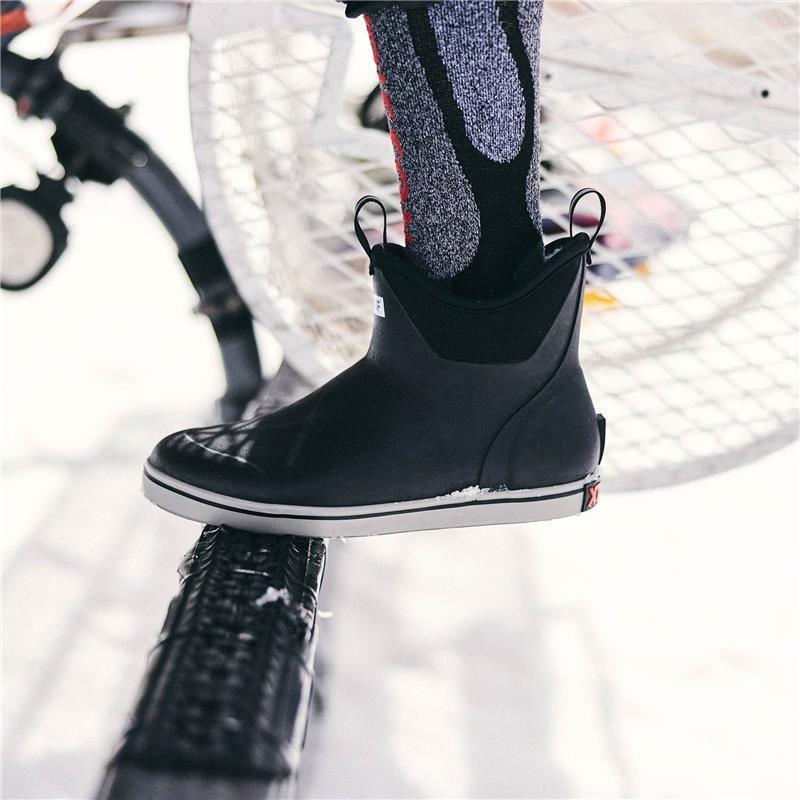 La gamma Ankle Deck Boot è stata sviluppata appositamente per i pescatori in mare. Poiché un pescatore è sempre in movimento, questi stivali sono concepiti come un vero equipaggiamento ad alte prestazioni per restare efficaci tutto il giorno. Il loro design leggero si basa su una suola Chevron antiscivolo, derivata dai modelli Legacy, che garantisce un'ottima tenuta su ponte bagnato o superfici scivolose. Facili da indossare e pronte all'azione, sono ideali per tutte le pratiche di pesca da imbarcazione. Questa versione marina si distingue per tocchi di blu chiaro sulla suola, sui tiranti e sulla fodera, per uno stile curato a riva.