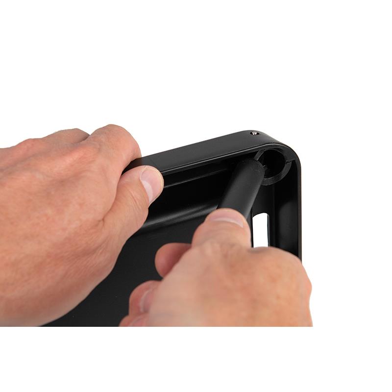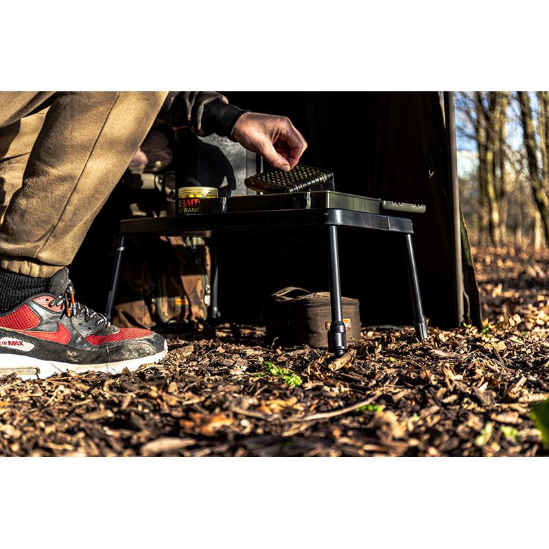 • modello progettato in modo che i piedi si ripieghino entro il perimetro del tavolo • tavolo molto sottile una volta ripiegato • piedi montati su molle per un'apertura e un ripiegamento molto rapidi • piedi regolabili individualmente tramite il sistema Fox cams