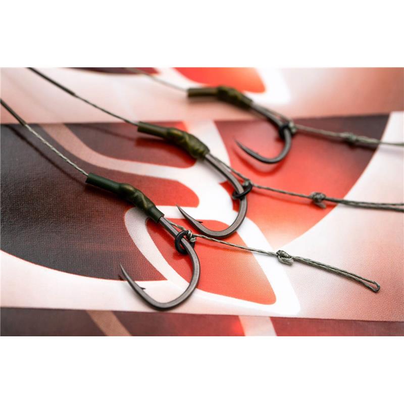 Non è mai stato così facile utilizzare uno dei montaggi preferiti di Danny Fairbrass, il « boss » di Korda. Il DF Carp Rig è infatti ora proposto in versione pronta all'uso, confezionato all'identico, con gli stessi componenti. Questo montaggio molto performante si usa sia con esche dense, wafters e pop-ups (a condizione di aggiungere un contrappeso) sia con l'anello di tipo blowback scorrevole sul gambo che, completato da un pezzo di guaina termorestringente, conferisce all'amo una maggiore aggressività, sinonimo di formidabile potenziale di ancoraggio.