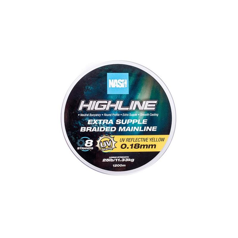 La variante riflettente UV della treccia Highline permette alle lenze di essere immediatamente identificate grazie alla sua finitura gialla ad alta visibilità di giorno e ai fili riflettenti UV che brillano di notte sotto il fascio della lampada frontale UV Powerbanx..