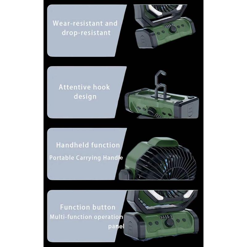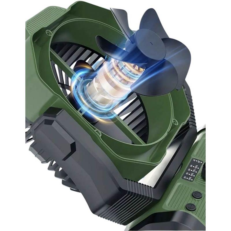 Caratteristiche principali : • Tecnologia a doppio motore per un funzionamento silenzioso Un sistema unico a due motori garantisce un flusso d'aria fluido ed efficiente con un minimo di rumore, ideale per i momenti di tranquillità e di relax. • Elevata resistenza all'acqua e alla polvere Le porte di ricarica rivestite in gomma proteggono il dispositivo dagli agenti esterni, rendendolo adatto a condizioni esterne impegnative. • Design multifunzionale Il ventilatore può essere sospeso o inclinato, e la sua rotazione elettronica permette di orientare il flusso d'aria esattamente dove ne avete bisogno. • Funzioni pratiche per un comfort ottimale Telecomando per le regolazioni a distanza Due modalità di illuminazione (bianco caldo e bianco freddo) per creare l'atmosfera ideale Modalità notte con brezza leggera e funzionamento ultra-silenzioso Timer per spegnimento automatico • Batteria potente da 20 000 mAh Offre grande autonomia e può anche fungere da batteria esterna per ricaricare i vostri dispositivi. • Opzioni innovative Possibilità di inserire una pastiglia anti-zanzare per tenere lontani gli insetti Indicatore del livello della batteria per un controllo semplice Regolazione continua della velocità per adattare l'intensità del ventilatore secondo le vostre preferenze