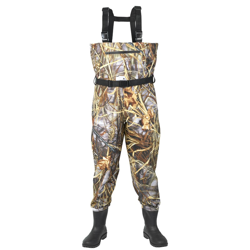 • Waders in nylon 210D • Spessore 0,40mm • Colore Camouflage • Flessibile e resistente • Cuciture rinforzate • Doppia tasca ventrale con cerniera impermeabile • Anelli per fissare accessori • Bretelle regolabili • Cintura da wading con passanti • Stivali con suole carrarmate