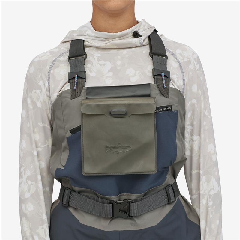 dettagli esterni all’esterno: tasca marsupio nella parte superiore e tasca sul petto con zip asimmetrica che offre un accesso rapido alle tue bobine di filo, pinze e galleggianti