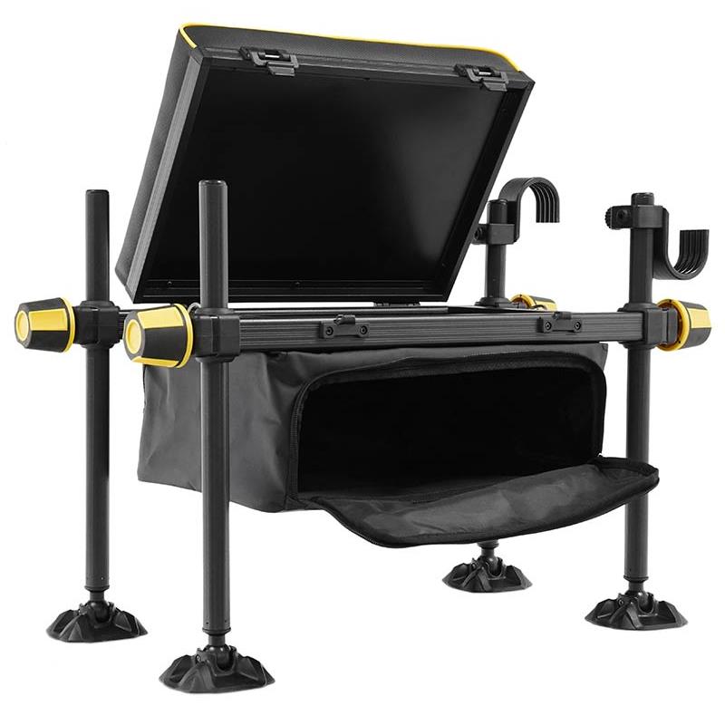 Seat Box molto facilmente trasportabile grazie al suo ridotto peso, con piedi regolabili del diametro di 25 mm, eccellente per l'utilizzo in diverse situazioni di pesca, sia in acqua dolce che in mare da scogliere o moli. Dotato di un modulo sedile sotto il quale si possono riporre le lenze o i piccoli pezzi e di un compartimento a sacco con apertura frontale zippata, realizzato in materiale impermeabile e molto facile da pulire. Questo compartimento consente di riporre sia scatole di piccoli pezzi sia vari accessori ed è accessibile senza aprire il sedile. Il cestello è dotato di un portacanne laterale ed è possibile personalizzarlo con moduli aggiuntivi opzionali.