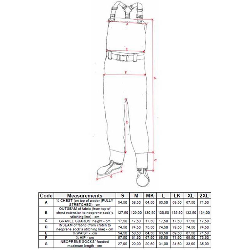 Ademende kuitwaders in versterkte ripstop-stof met 3 en 5 lagen voor vissen in rivieren, op rotsen, op het strand of voor vissen met een float tube. Ripstop-stof met waterdicht laminaat (WP 20.000mm)/ademend 3-lagen (WP 20000mm) op het bovenlichaam en 5 lagen van de taille tot de enkels. Waterdichte naden met afdichtingen van Japanse makelij. Borstzakken met waterafstotende YKK-ritsen (LET OP : dit is geen waterdichte zak). Binnenzak met rits. Verstelbare elastische schouderbanden voor meer comfort. De gecombineerde borstsluiting voor heren/dames maakt het mogelijk de waders om de taille heen te vouwen en vast te zetten door de schouderbanden om te vormen tot een riem. Verstelbare elastische tailleband met neopreen heuptasje. Ringen om accessoires en gereedschap aan te hangen. Elastische gamaschen van SCR-neopreen om het aantrekken en ophangen van de laarzen te vergemakkelijken. Neopreen sokken, zool met hoge dichtheid en rubberen versteviging bij hiel en achillespees om slijtage van de laars te voorkomen. Draagtas.