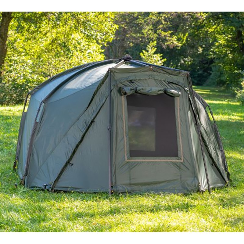 Twee mooie grote ramen met muggengaas aan de achterkant van de tent zorgen voor een optimale luchtcirculatie, zelfs in de zomer. • Systeem van 8 weerbestendige baleinen, inclusief een permanent geïnstalleerde triple dakstabilisator • Materiaal: polyester 210D FDY met speciaal Hi-Trox 4-laags buitenmateriaal (2 x lichtreflectie, 1 x lichtblokkering, 1 x warmteabsorptie) voor maximale UV-bescherming in de tent, en een gegarandeerd koel binnenklimaat