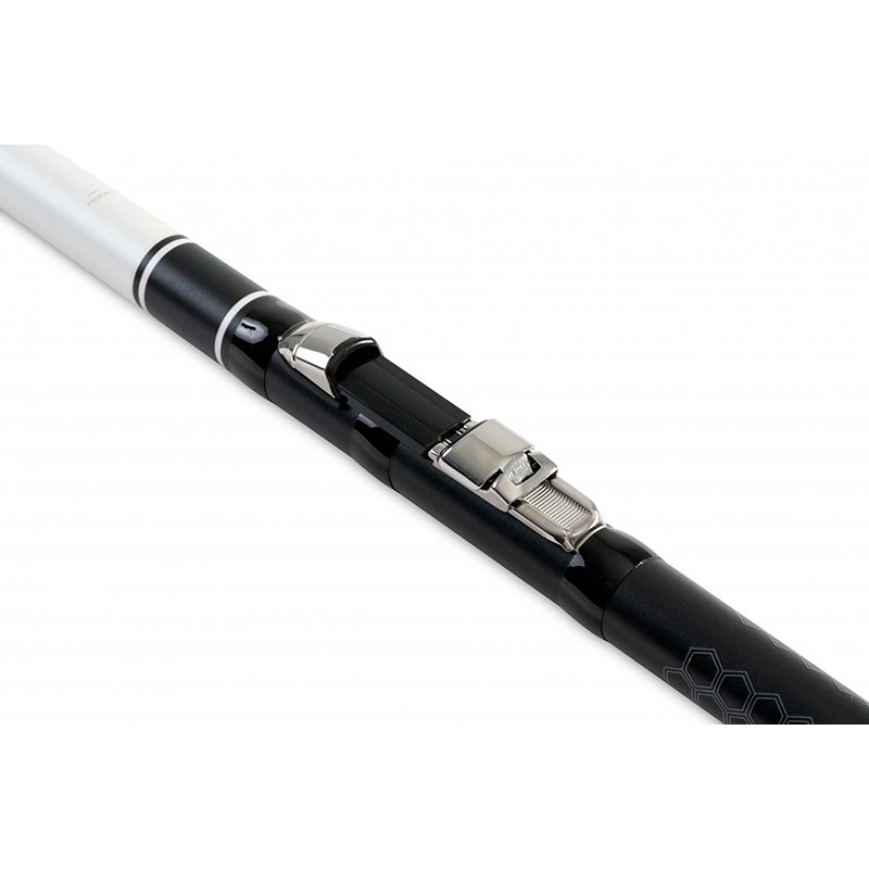 Deze robuuste kap bevestigt zich stevig op de geleidringen zodra de hengel is ingeklapt, en voorkomt stoten, vervorming of slijtage.