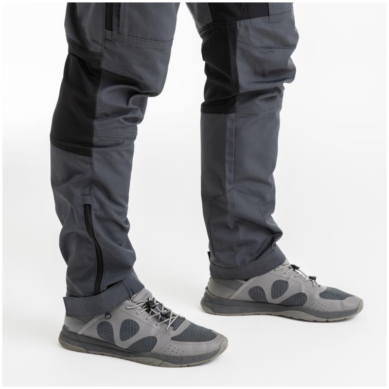 Outdoorbroek voor heren van geïmpregneerd, waterafstotend en windbestendig materiaal. Hij zorgt dat u langer droog blijft, zelfs bij slecht weer. De anatomische knievorm maakt vrij bewegen mogelijk, terwijl het losmaken van het onderste deel van de broekspijpen het aantrekken van schoenen vergemakkelijkt. Twee van de vier zakken zijn voorzien van ritsen. De opening voor de riem maakt het mogelijk de taille naar wens aan te passen. De broek heeft in totaal vier zakken, twee aan de voorkant en twee aan de achterkant. De knopen zijn versierd met de tekst Adventer & fishing. Een reserveknoop is inbegrepen.