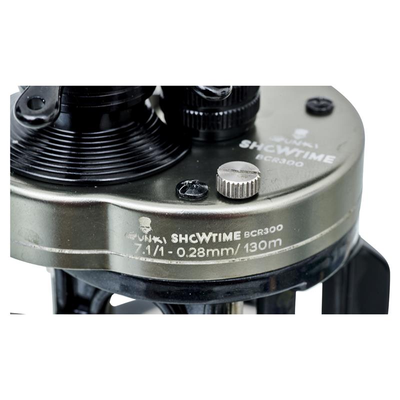 De baitcasting-molen GUNKI SHOWTIME BCR 300 heeft een rond profiel dat bijzonder gewaardeerd wordt door liefhebbers van « big bait ». Voorzien van een precieze en duurzame mechaniek heeft dit model een tamelijk snelle overbrengingsverhouding (7.1:1 = recuperatie van 79cm/ TMV), maar bovenal veelzijdig, waardoor de juiste inhaalsnelheid kan worden aangehouden (langzamer of met acceleratie) afhankelijk van de gebruikte techniek (cranking, jerking ...etc). Krachtig en soepel: de precisie van de bewerking van zijn tandwielen en van zijn monobloc-constructie (in Aluminium) zorgt voor betrouwbaarheid, comfort en prestaties. Compact en strijdklaar is hij uitgerust met een aluminium hendel (links) van groot formaat (11cm) en oversized EVA-handgrepen die een aangename en geruststellende grip bieden. Zijn lijngeleider met grote opening en zijn capaciteit zijn aangepast voor het gebruik van gevlochten lijn met grote diameter. Een product ontworpen voor de jacht op grote vissen, zowel qua worp-prestaties als in het vermogen om de grootste exemplaren te bestrijden. De oplossing om onder alle omstandigheden de controle te behouden zonder compromissen op het gebied van betrouwbaarheid en prestaties! Magnetische werprem. Krachtige gevechtsrem (15kg). Micrometrische regelwieltjes. Vermogensbereik: kunstaas 50-250g. Spoel met grote capaciteit, ontworpen met een nok waarmee u uw gevlochten lijn stevig en gemakkelijk kunt bevestigen.
