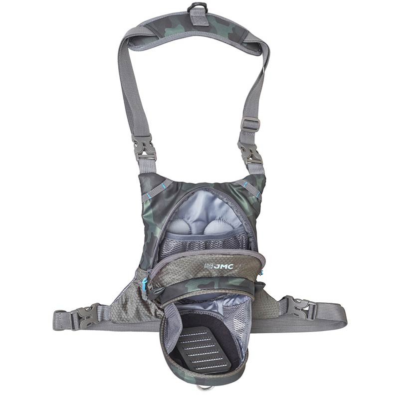 compacte chestpack met magnetische behuizing voor ultra-snelle toegang tot een ykk-ritsvak, gecompartimenteerd met een elastisch meshvak. waterafstotende camo-stof, versterkt met honingraatstructuur voor stevigheid. gewatteerde rug met mesh voor ademend vermogen. gewatteerde nekversteviging met d-ring draagring voor het schepnet. mogelijkheid om te dragen als schoudertas « musette » of als borst-chestpack om diep het water in te gaan. talrijke bevestigingspunten voor accessoires.