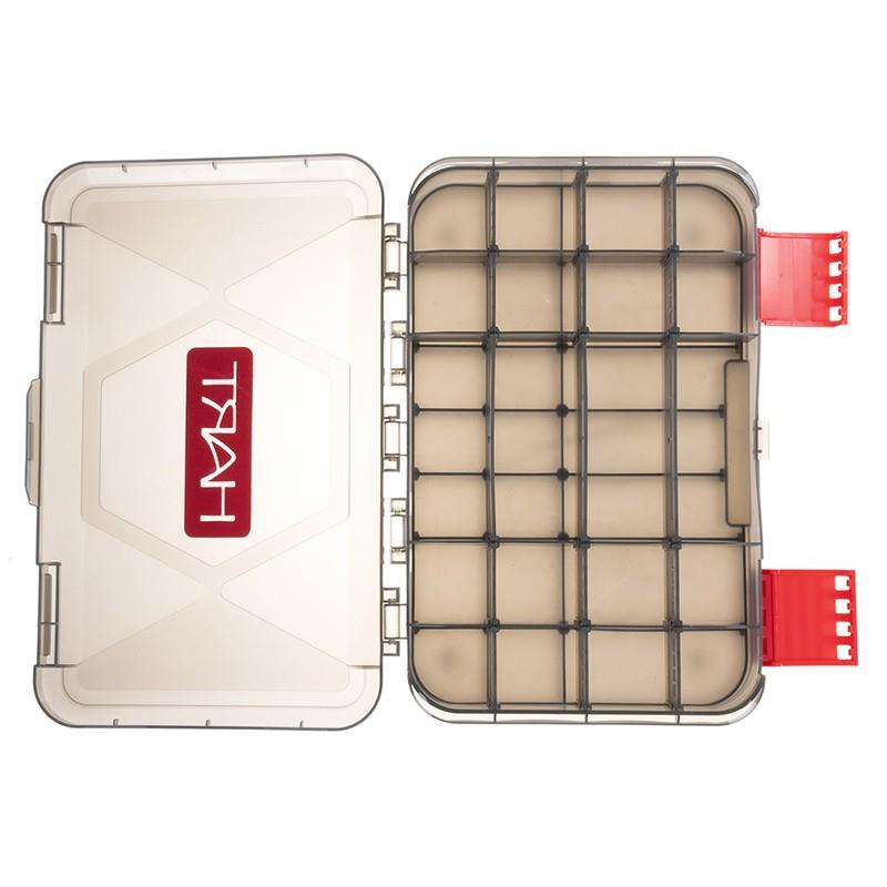 Plastic doos met verplaatsbare compartimenten in twee hoogtes.