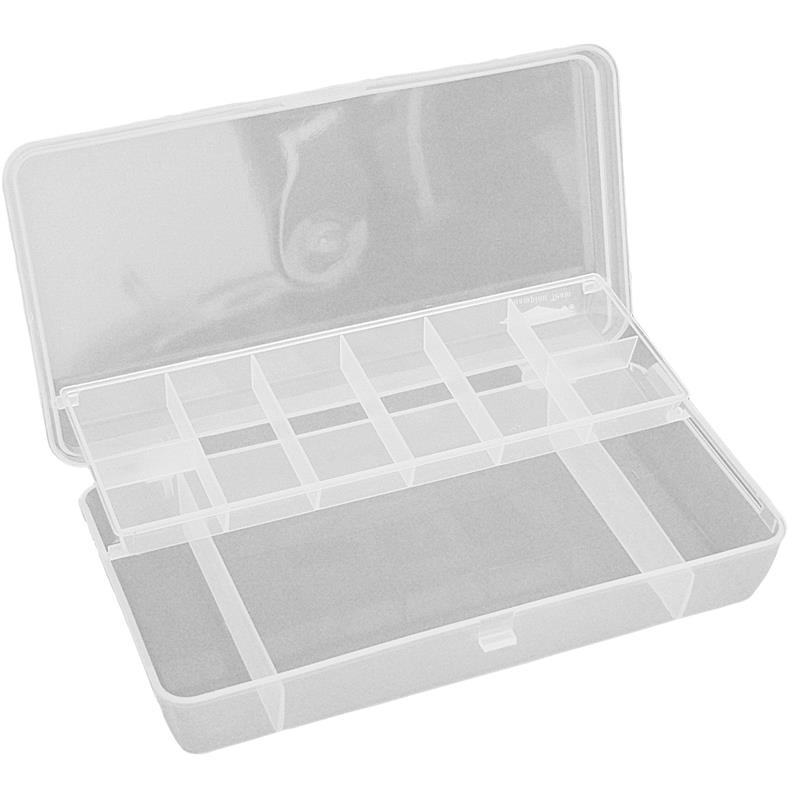 serie doosjes van kleine tot middelgrote maat, in transparant plastic om hun inhoud goed te kunnen identificeren, om in een zak op te bergen, met verstelbare compartimenten om ieders organisatie te vergemakkelijken.