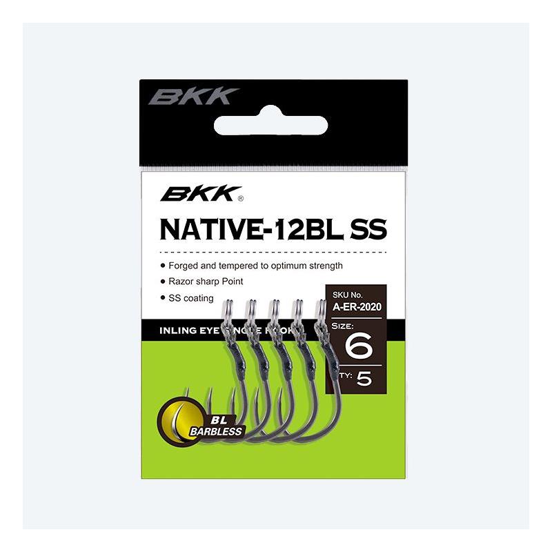 de bkk native-12 is een op assist gemonte haak ontwikkeld om de triples en de gangbare enkelhaken te vervangen wanneer het verminderen van torsiekrachten het meest noodzakelijk is. de kenmerken omvatten een scherp naar binnen gedraaide punt om de beste haakzet /greep te verzekeren , een krachtige staalsterkte voor verhoogde weerstand en de supergladde ss-coating voor snelle penetratie