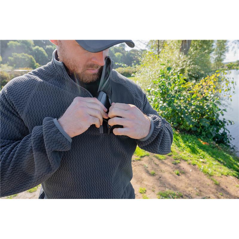 Een fleece met rits bij de hals, licht maar warm met een honingraatachtige textuurafwerking. Ontworpen met een borstvak voor telefoon en elastische manchetten — de ideale tussenlaag voor koelere omstandigheden.
