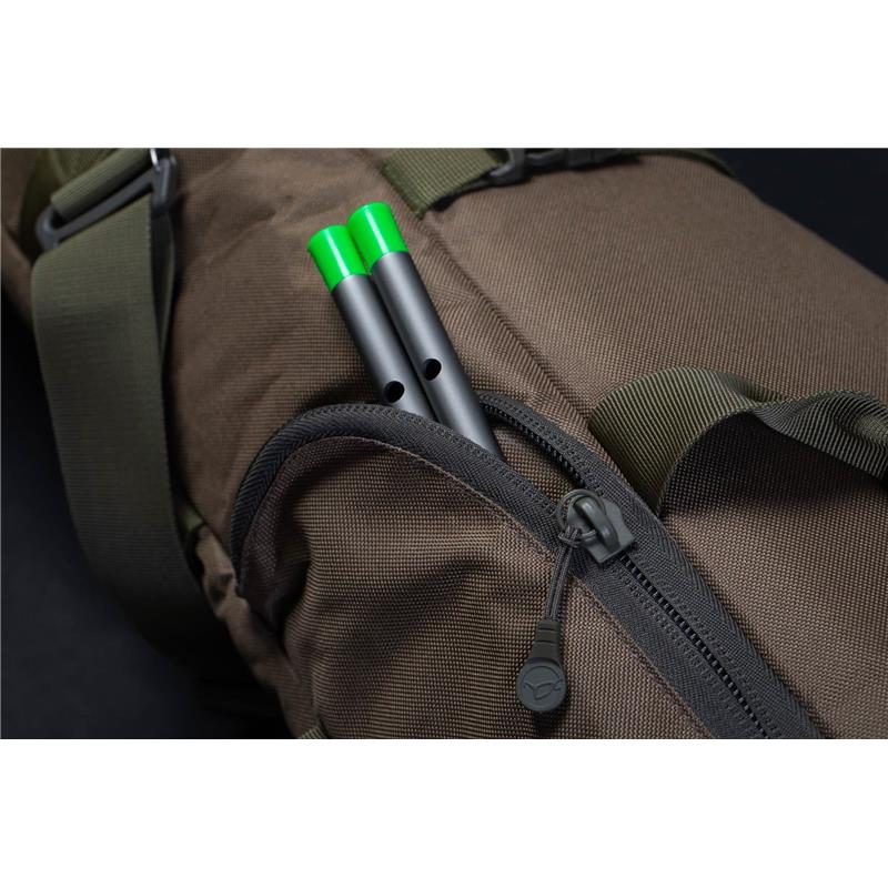 De compac telescopic rod holdall is speciaal ontworpen om drie 10-voet hengels, volledig afgemonteerd met telescopische butts, te vervoeren. De hoes is ontworpen om standaard 10-voet hengels en hengels met een verkorte butt te huisvesten. Hij biedt voldoende ruimte om zelfs de grootste molens te herbergen en aan de zijkant bevindt zich een klein vakje om je lood na je sessie in op te bergen. Bovendien is er op de achterkant van de hoes een vak voor het landingsnet en voor prikkers. De compac-bagage is vervaardigd met hoogwaardige materialen en componenten van militaire kwaliteit, waardoor een georganiseerd, stevig, licht en duurzaam bagagesysteem ontstaat.