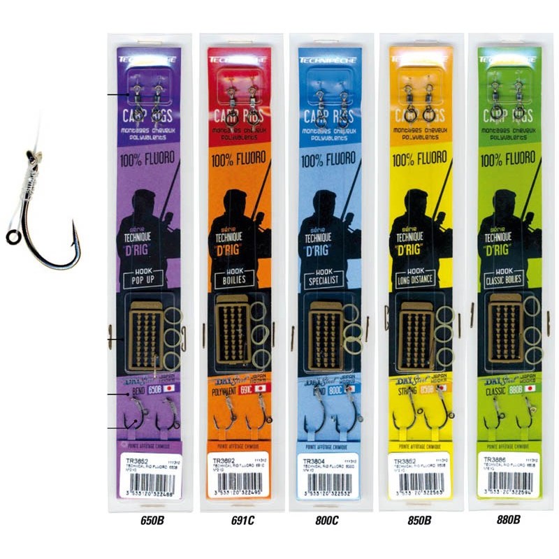 - 650B voor Pop up : de vorm van deze haak is bestudeerd voor het vissen met zaden in pop-up. De schacht is kort, afgerond, met een naar binnen gerichte punt. Het oogje dat naar binnen is gericht geeft de montages een oriëntatie die meer inhaking mogelijk maakt.