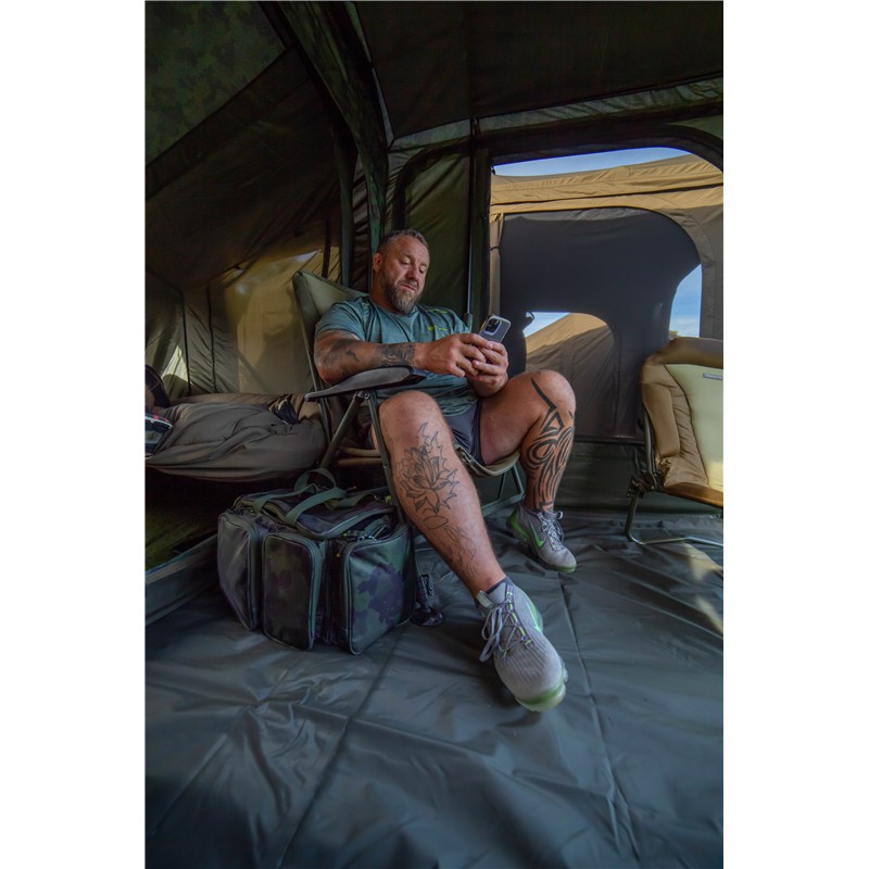 Deze grote PVC-vloerbedekking biedt niet alleen een extra waterdichte beschermlaag onder uw biwy XF2, waardoor het genaaide grondzeil in optimale staat blijft, maar het strekt zich ook uit om de volledige voetafdruk van de XF2 v2 luifelverlenging te bedekken, waardoor al uw waardevolle spullen. , uitrusting en bagage beschermd worden tegen contact met de vochtige grond. Essentieel om het hele onderkomen schoon en droog te houden, helpt de extra verdedigingslaag ook te beschermen tegen perforaties of schade aan het genaaide bivvy-grondzeil. Wanneer de luifel niet wordt gebruikt, kan het robuuste maar zachte materiaal dubbelgevouwen worden, waardoor er een dubbele basislaag onder de biwy ontstaat voor maximale bescherming.