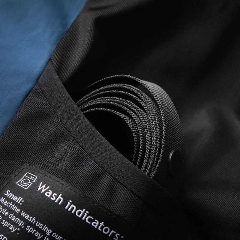 dozer light heeft een opvouwbaar draagbandsysteem voor handsfree vervoer wanneer de jas niet voldoende ademend is. de draagband kan eenvoudig worden opgeborgen in een daarvoor bestemde binnenzak wanneer deze niet wordt gebruikt.