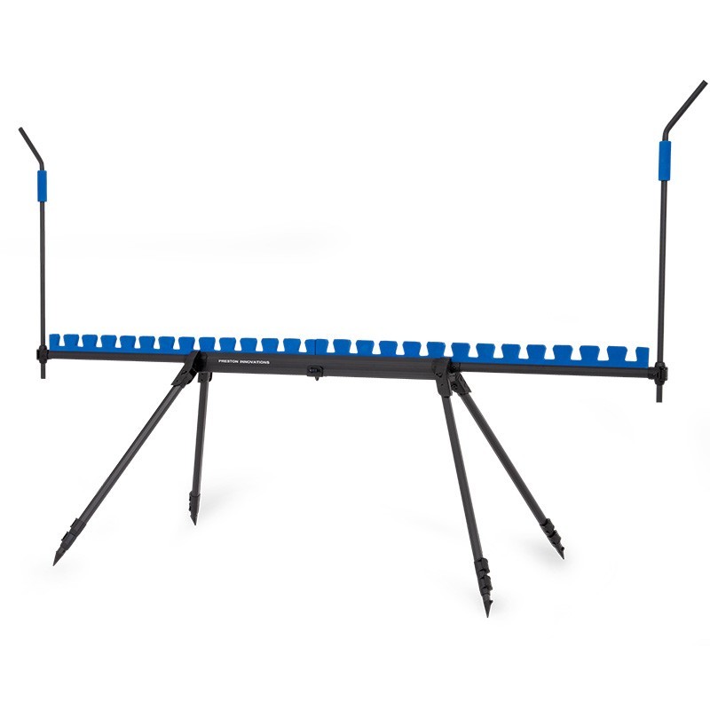 Een veelzijdige steun, ontworpen om een groot aantal hengels of hengelsets te huisvesten en uitgerust met afstandssticks.