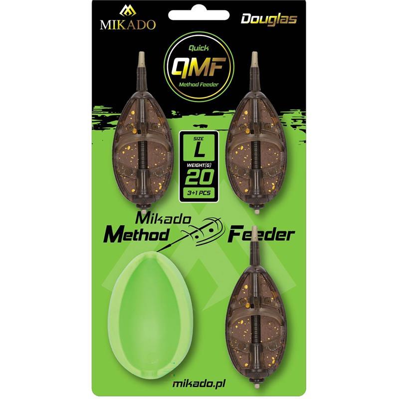 Kit van 3 method feeders QMF Mikado Douglas Quick maat L van hetzelfde gewicht, met hun method vorm.