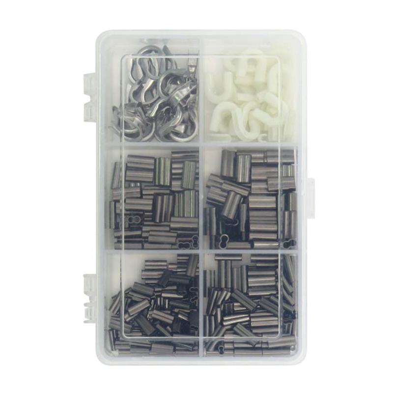 • Sleeves Ø : Aantal • Mini dubbele sleeve 1.3 mm : 100 stks • Mini dubbele sleeve 1.6 mm : 100 stks • Mini dubbele sleeve 1.9 mm : 50 stks • Mini dubbele sleeve 2.2 mm : 50 stks • RVS S-klem : 25 stks • Nylon fosfo L-klem : 25 stks