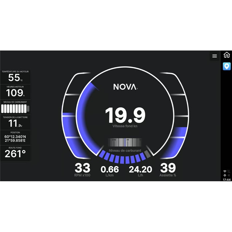 De NOVA-schermen maken het mogelijk om alle NMEA2000-gegevens die op het boordnetwerk circuleren op één plaats te centraliseren. Zo kunnen motorinformatie (verbruik, tankniveaus, temperatuur, toerental…), windgegevens (snelheid, richting, kracht…), navigatiegegevens (koers en snelheid over grond of water, GPS-positie…), en weersinformatie (lucht-, watertemperatuur, luchtdruk…) worden weergegeven op een aanpasbaar scherm als de juiste sensor op het NMEA2000-netwerk aanwezig is.