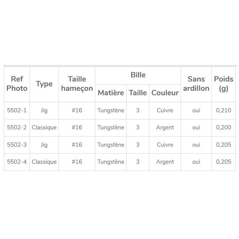 5502-3 : lichte rechte nimf, geclassificeerd als imitatieve nimf. montage met opgezette haasharen en staartvezels om een zwevende en natuurlijke zwemactie te verkrijgen. kraal en omwikkeling in koper om een neutrale uitstraling te behouden.