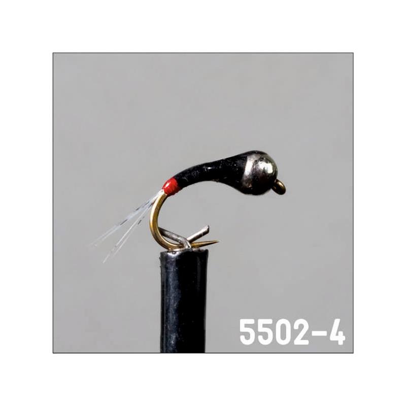 5502-4 : lichte gebogen nimf, geclassificeerd als imitatieve nimf. perdigone-montage met glad zwart lichaam en staartvezels die het zinken vergemakkelijken. aangevuld met een tag in bloedkleur aan de achterzijde om een subtiel prikkelend signaal aan de imitatie te geven.