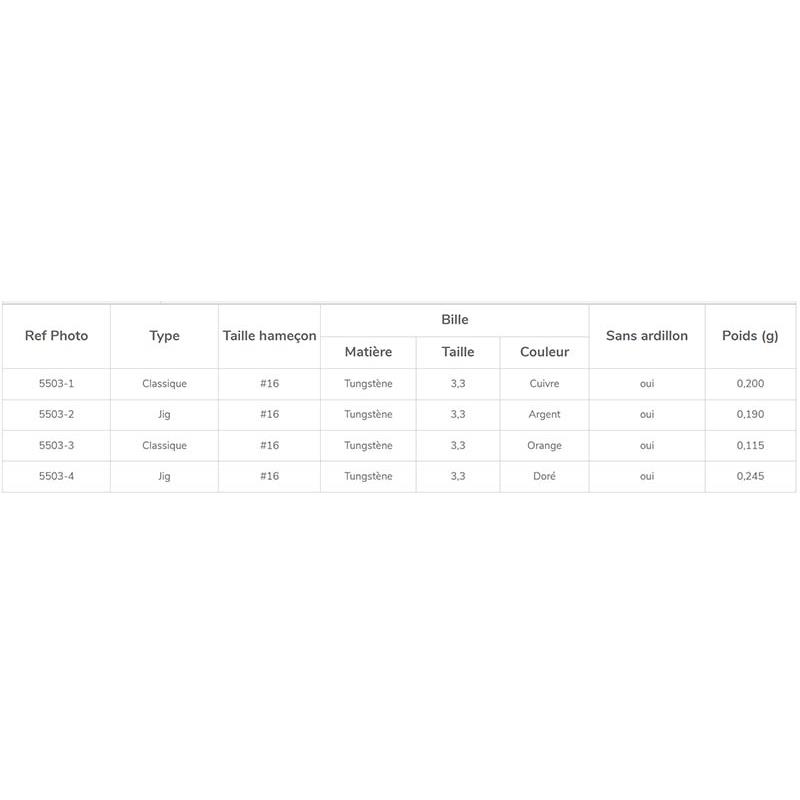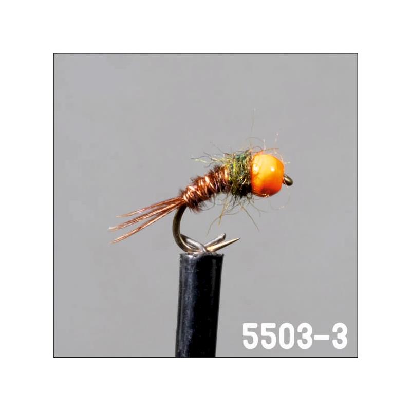 5503-3 : Lichte gebogen nimf, geclassificeerd als een aanzettende nimf. Lichaam gemonteerd in fazant omwikkeld met koperdraad om een natuurlijke uitstraling te bieden. Fluoriserende oranje kopkogel en toevoeging van een thorax van synthetische vezels in olijfkleur om lichte reflecties te garanderen en de imitatie te benadrukken.