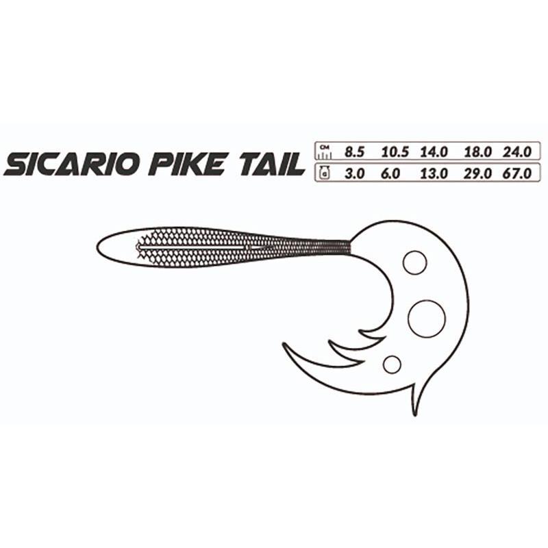 Zijn realistische uiterlijk, intense staartactie en transparante veters maken het zachte Sicario aas perfect om verschillende soorten roofvissen te vangen.