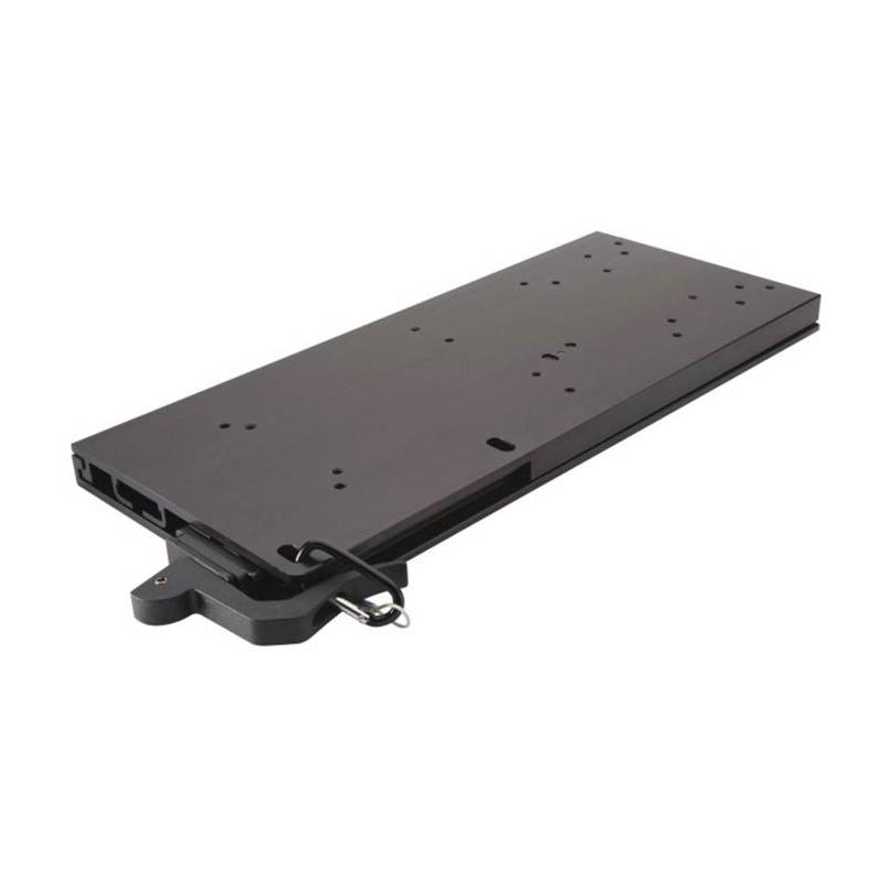 Quick-release-functie voor snel losmaken. Basis van geanodiseerd aluminium met zwarte afwerking. De steun bevat een beveiligingssluiting voor hangslot. Kit bestaande uit een bovenplaat en een onderplaat.