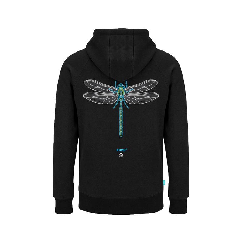 Grafische hulde aan de iconische keizerlibel. Deze fijnlijnige illustratie vangt de details van de delicate structuur van zijn vleugels, in elektrische tinten blauw en groen. Zeefdruk in 5 kleuren op onze ultra-zachte en luxueuze geborstelde stof van 280 g, met een geweven label aan de zijkant.